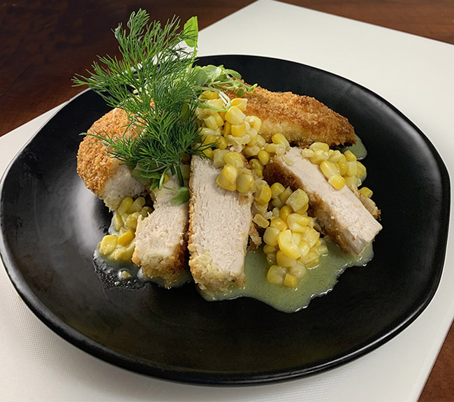 Toasted Coconut & Panko Pan-Fried Chicken Breasts with Coconut Creamed Corn by Foodie’s Chef Laura Brennan